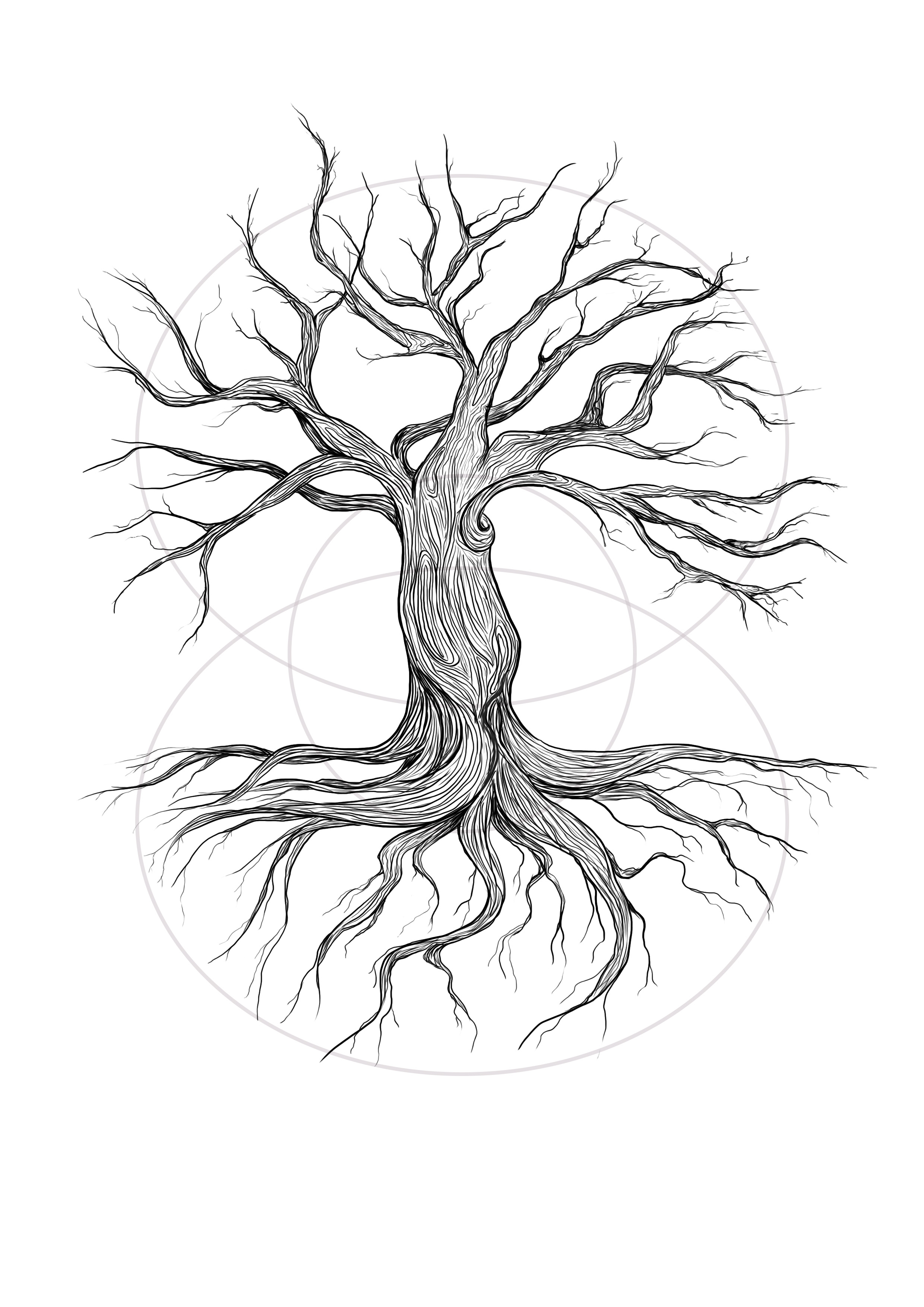 Voor het ontwerp begon ik met een cirkel als basis. Vanuit die cirkel kon ik de structuur van de boom en de wortels ontwikkelen. De boom is opgebouwd uit veel lijnen, wat een gedetailleerde en dynamische uitstraling geeft. Om de boom heen voegde ik extra decoratie toe die te maken had met de stand van de zon en de maan. Deze elementen versterkten de symboliek en het geheel van het ontwerp.