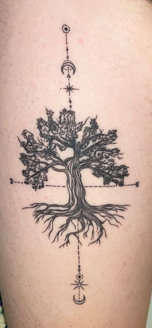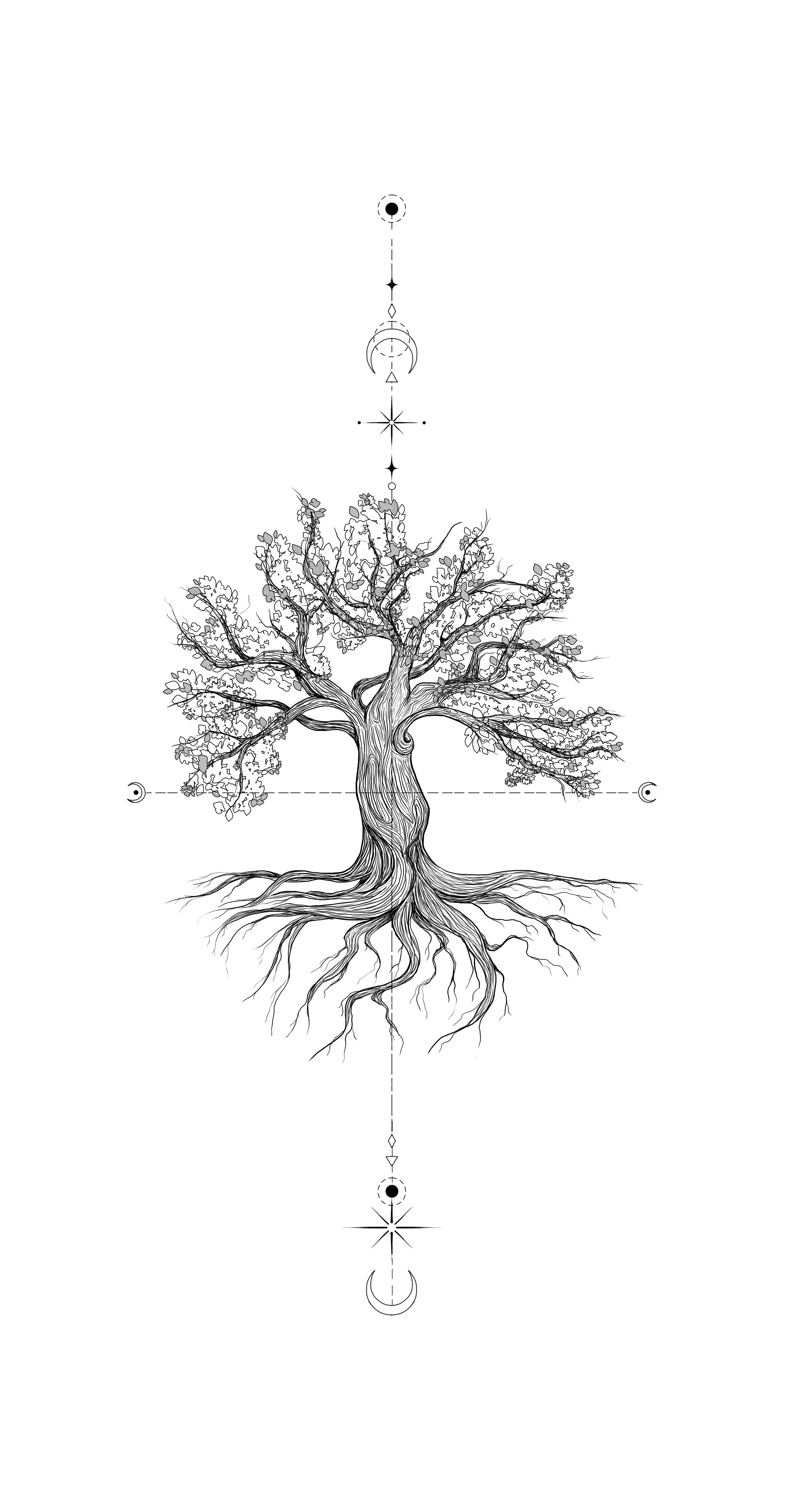 Voor het ontwerp begon ik met een cirkel als basis. Vanuit die cirkel kon ik de structuur van de boom en de wortels ontwikkelen. De boom is opgebouwd uit veel lijnen, wat een gedetailleerde en dynamische uitstraling geeft. Om de boom heen voegde ik extra decoratie toe die te maken had met de stand van de zon en de maan. Deze elementen versterkten de symboliek en het geheel van het ontwerp.
