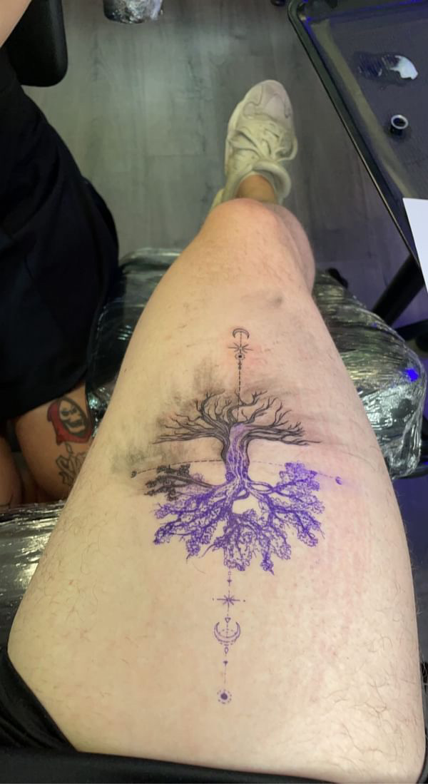 Ik werd gevraagd om een ontwerp te maken voor Jerne’s eerste tatoeage. Hij wilde graag een tatoeage van een boom, vaak aangeduid als "The Tree of Life". Dit symbool staat voor het idee dat de bladeren van de boom even groot zijn als de wortels, wat de verbinding tussen het leven symboliseert. Deze tatoeage was bedoeld ter nagedachtenis aan zijn overleden opa, wat ik een bijzonder en mooi idee vond.