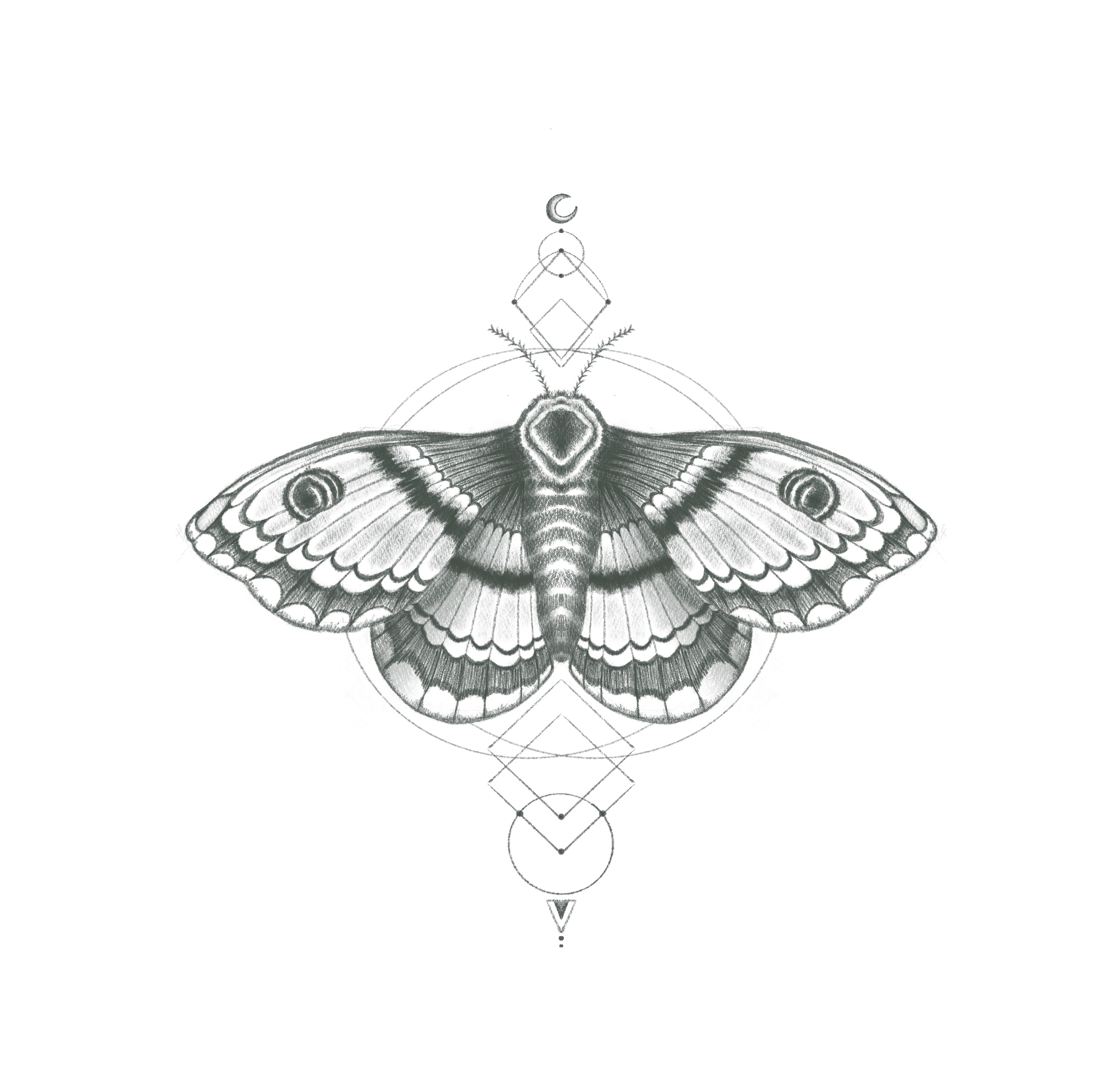Toen ik de ontwerpen naar Jerne stuurde, wist hij meteen welke het beste bij hem paste. De mot met geometrische vormen bleek precies te zijn wat hij zocht en sloot perfect aan bij zijn vorige tatoeage, de boom.